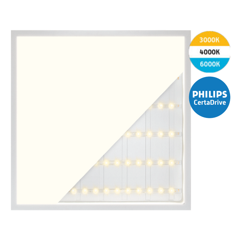 Het back-lit LED paneel bevat een opalen afschermingsplaat met een speciale techniek dat resulteert in een goede verblindingswaarde (UGR<22). Een back-lit paneel heeft geen diffuser nodig omdat de leds op de achterkant van het paneel gemonteerd zijn. Hierdoor gaat minder licht verloren en is er een egale lichtverdeling en perfecte warmte afgifte. Het armatuur beschikt over drie lichtkleuren: 3000K, 4000K, en 6000K. De gewenste kleur is in te stellen middels de schakelaar aan het snoer. De driver is ingesteld op 32W met 125Lm/w, middels het omzetten van de voedingkabel in de 2e voedingspoort levert de driver 37W en straalt het armatuur tot 4500 lumen. Vanwege de back-lit